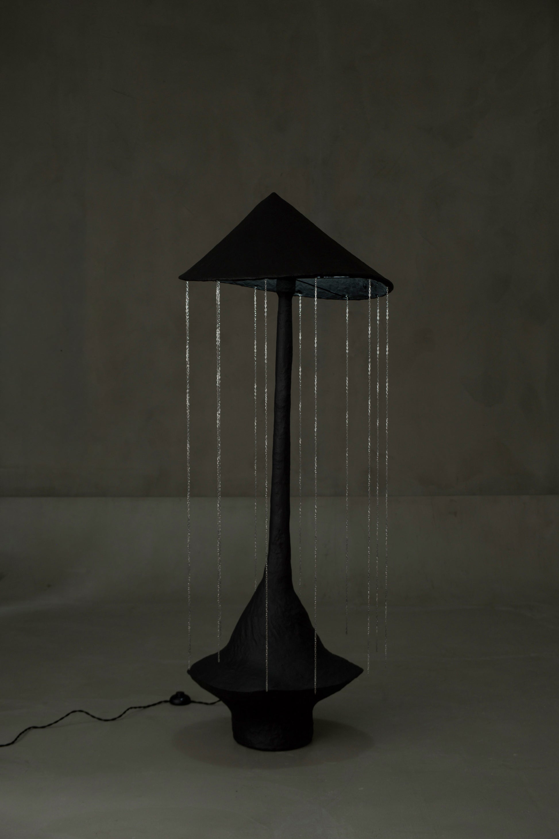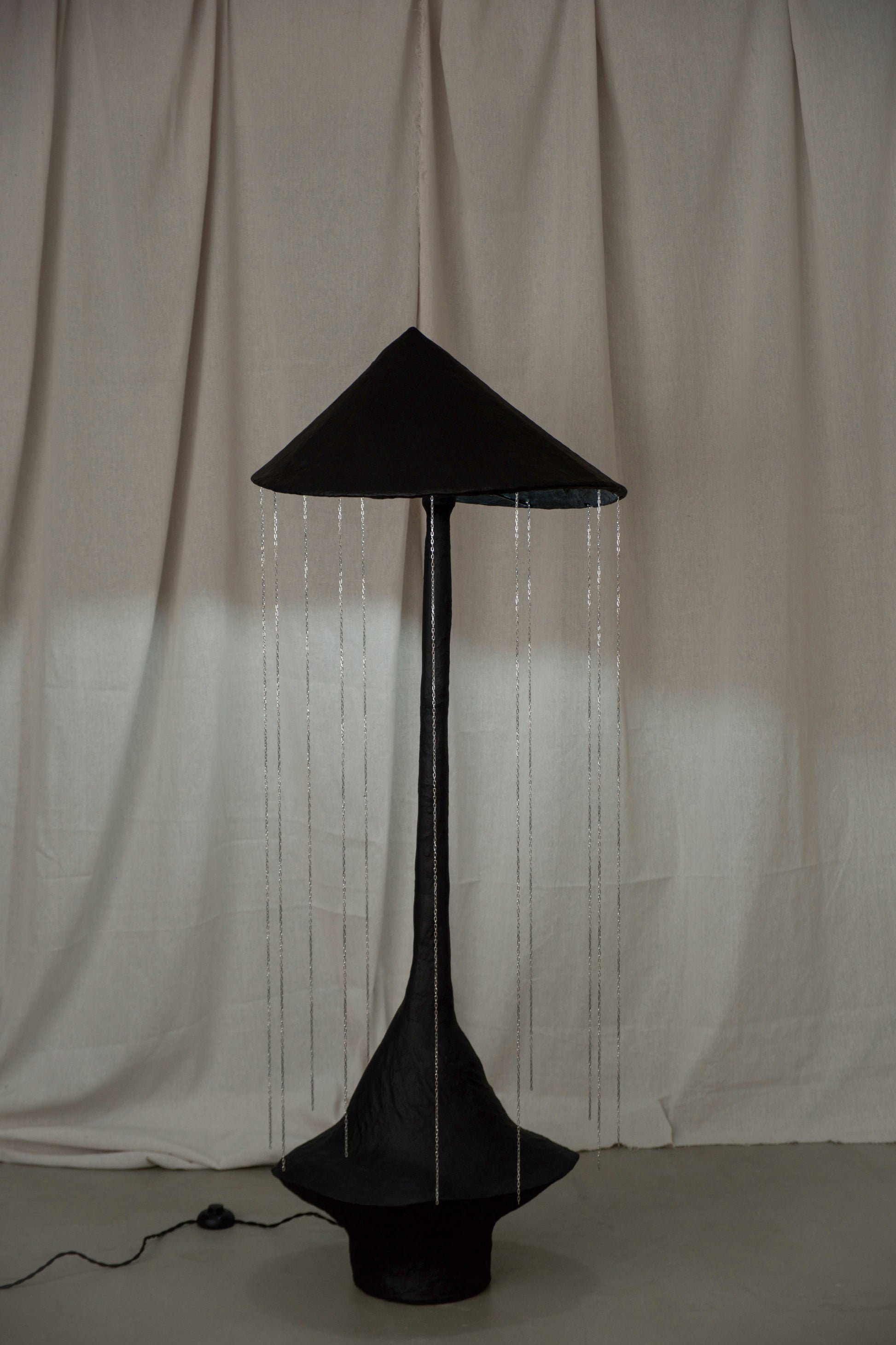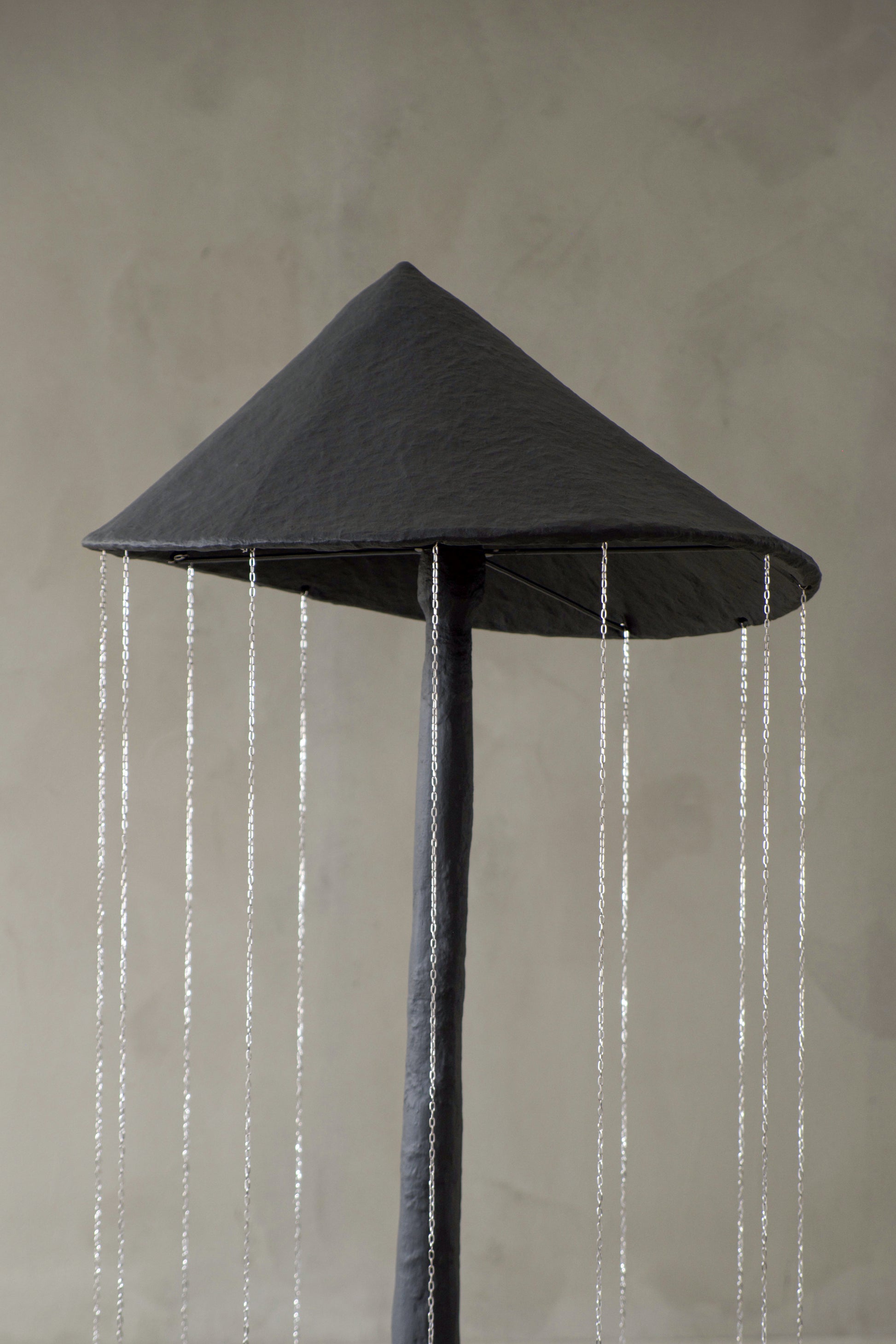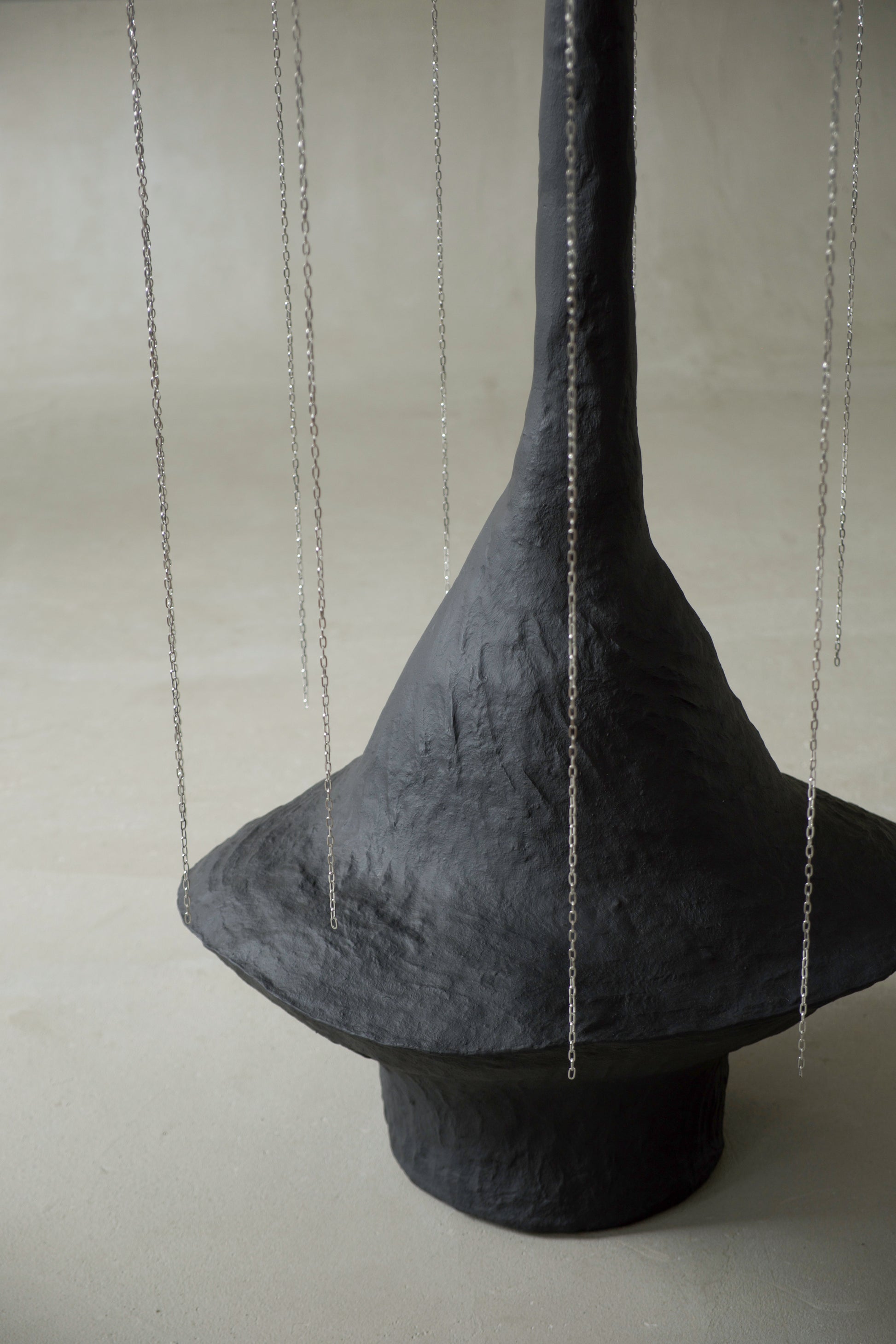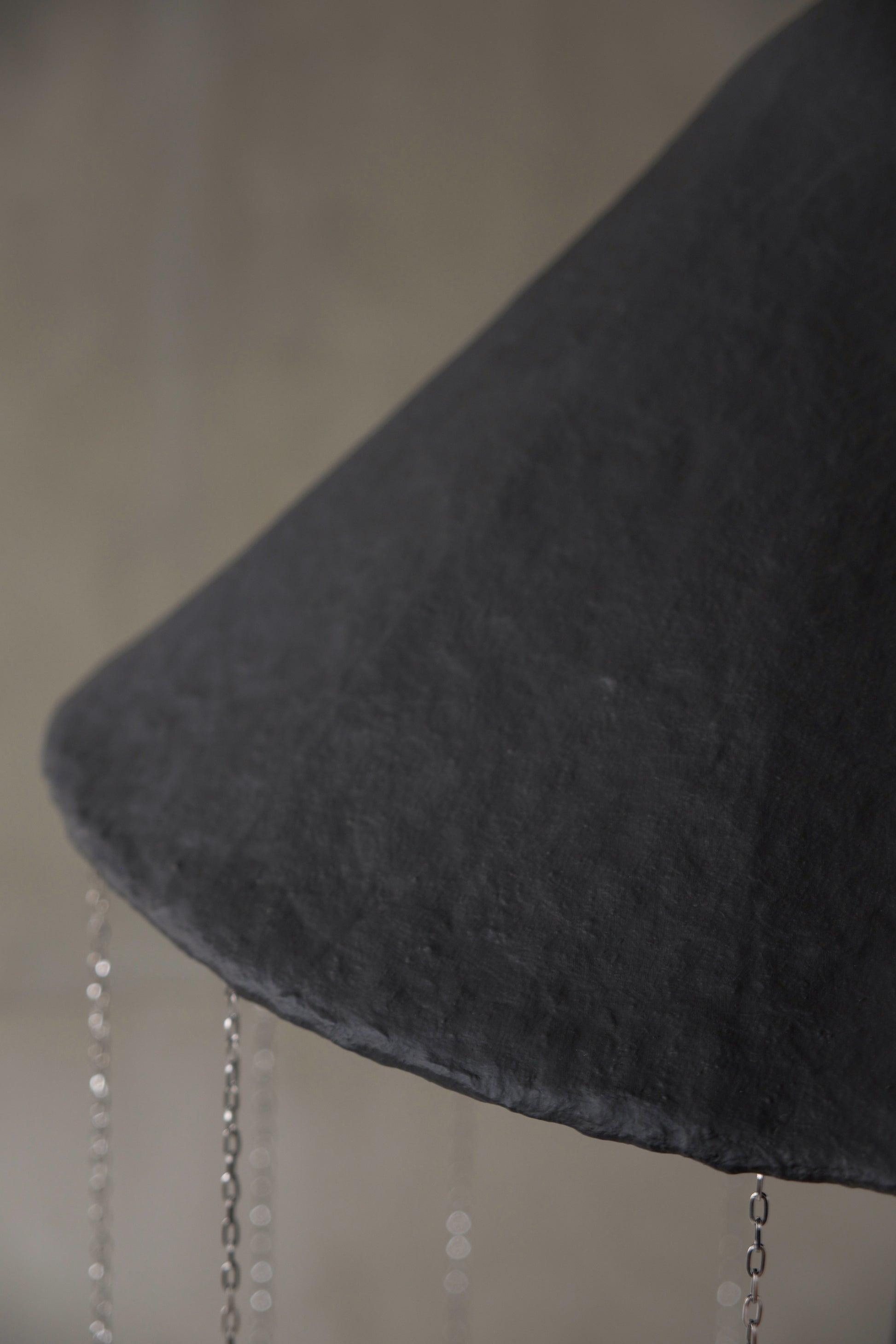 A cascade of stainless steel chains descends from beneath the shade, introducing a visual tension between gravity and restraint.