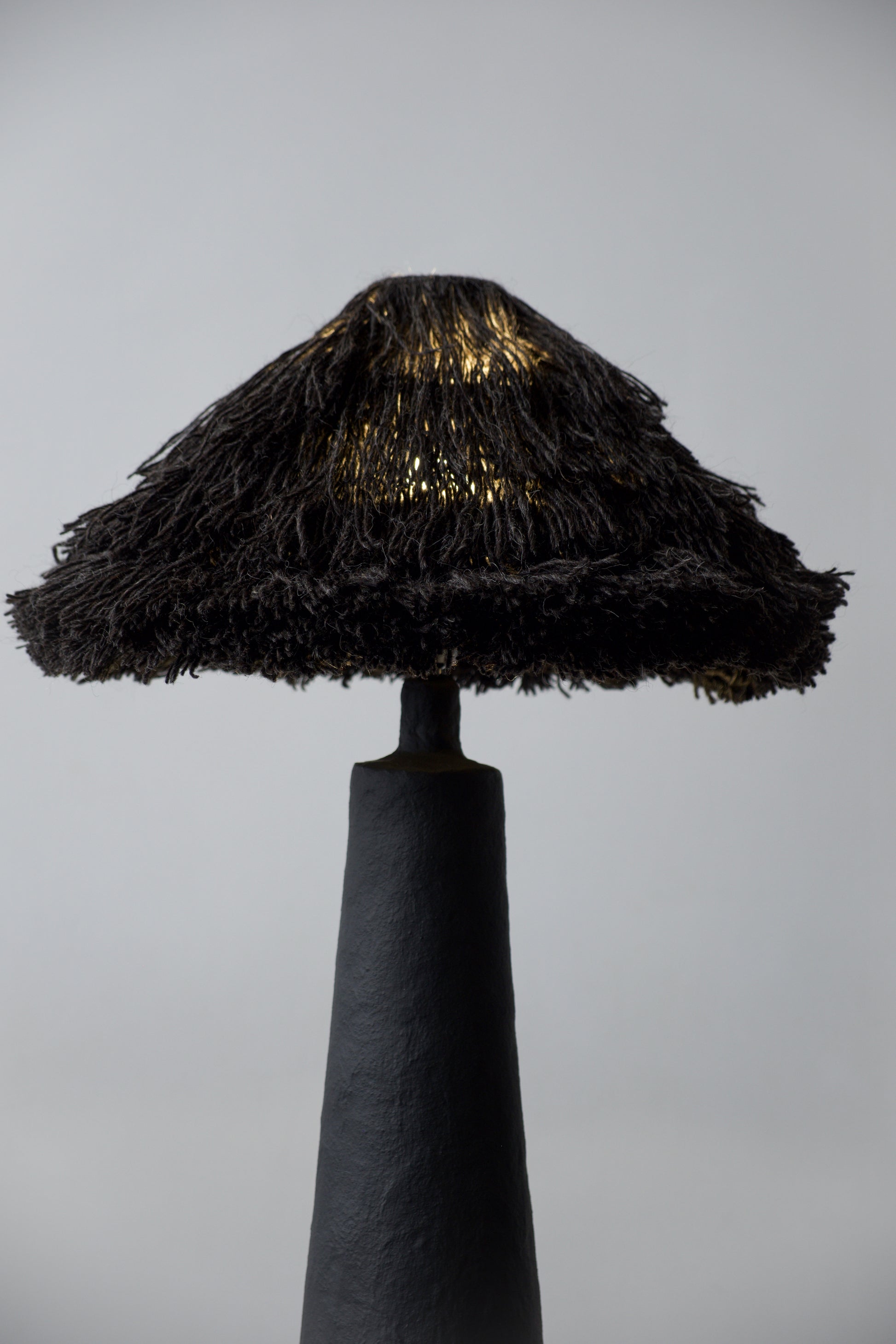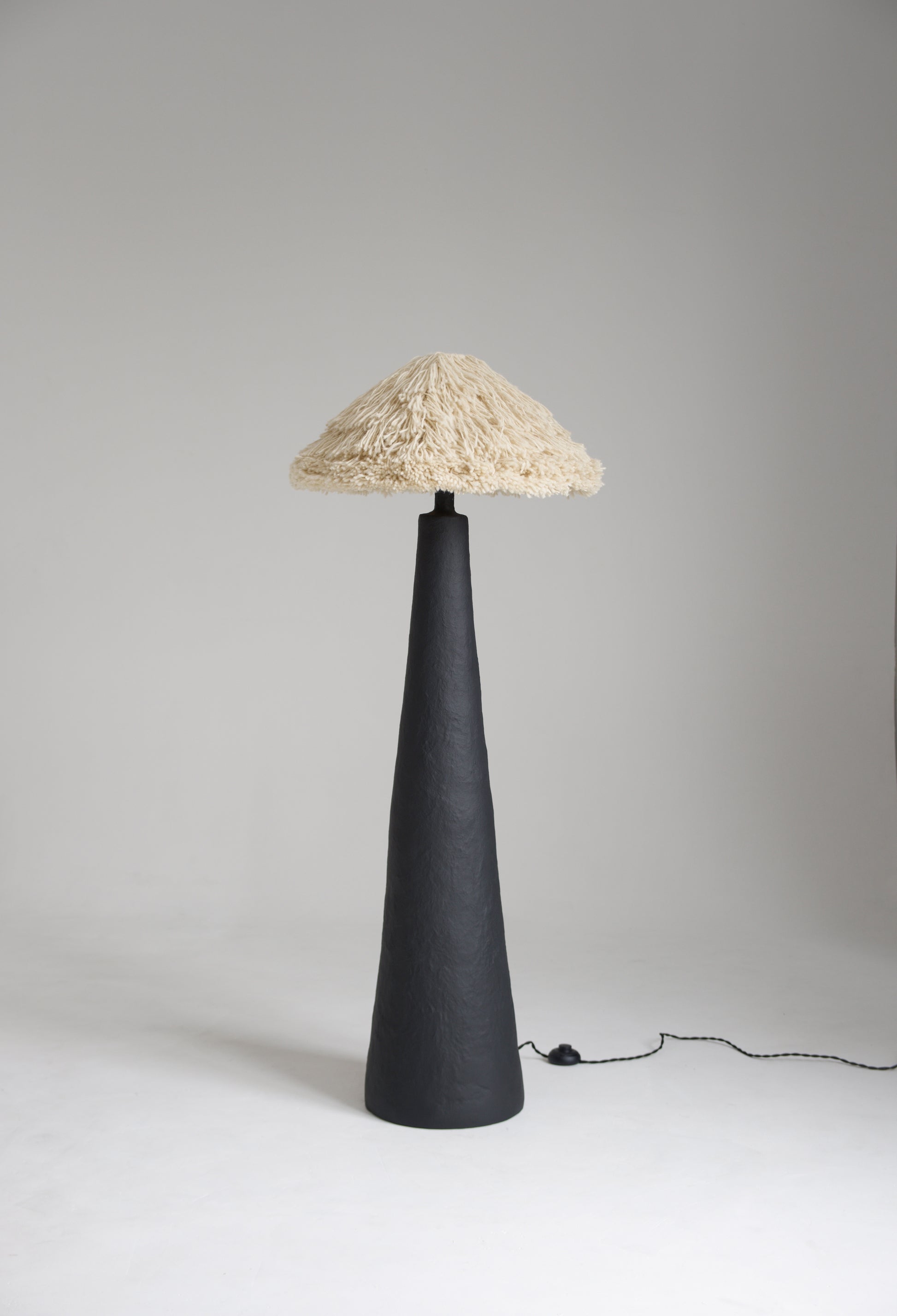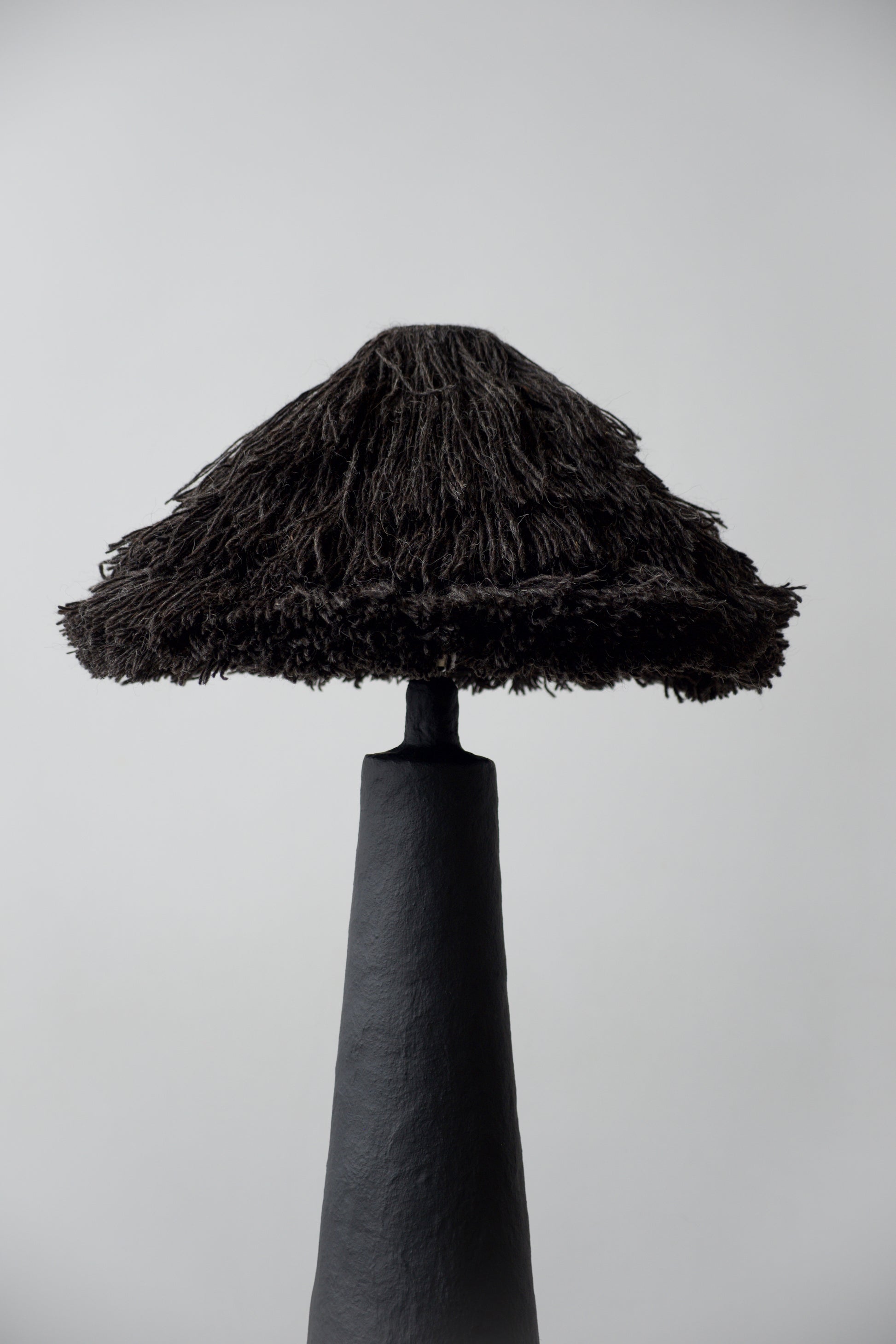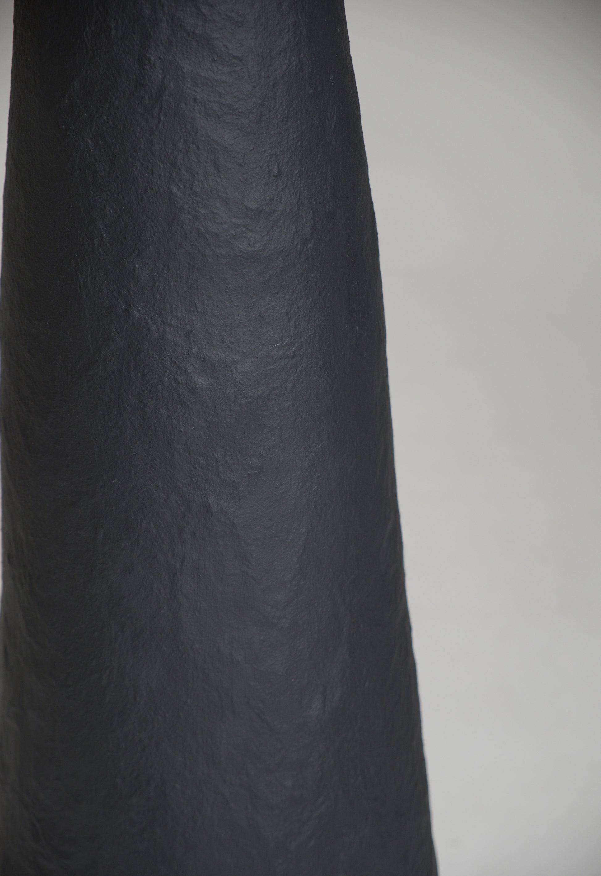 The base is sculpted by hand, preserving subtle irregularities and traces of the making process, and finished in a deep matte black surface. Its monolithic, tapering silhouette creates a grounded, architectural presence, acting as a visual anchor within the space.