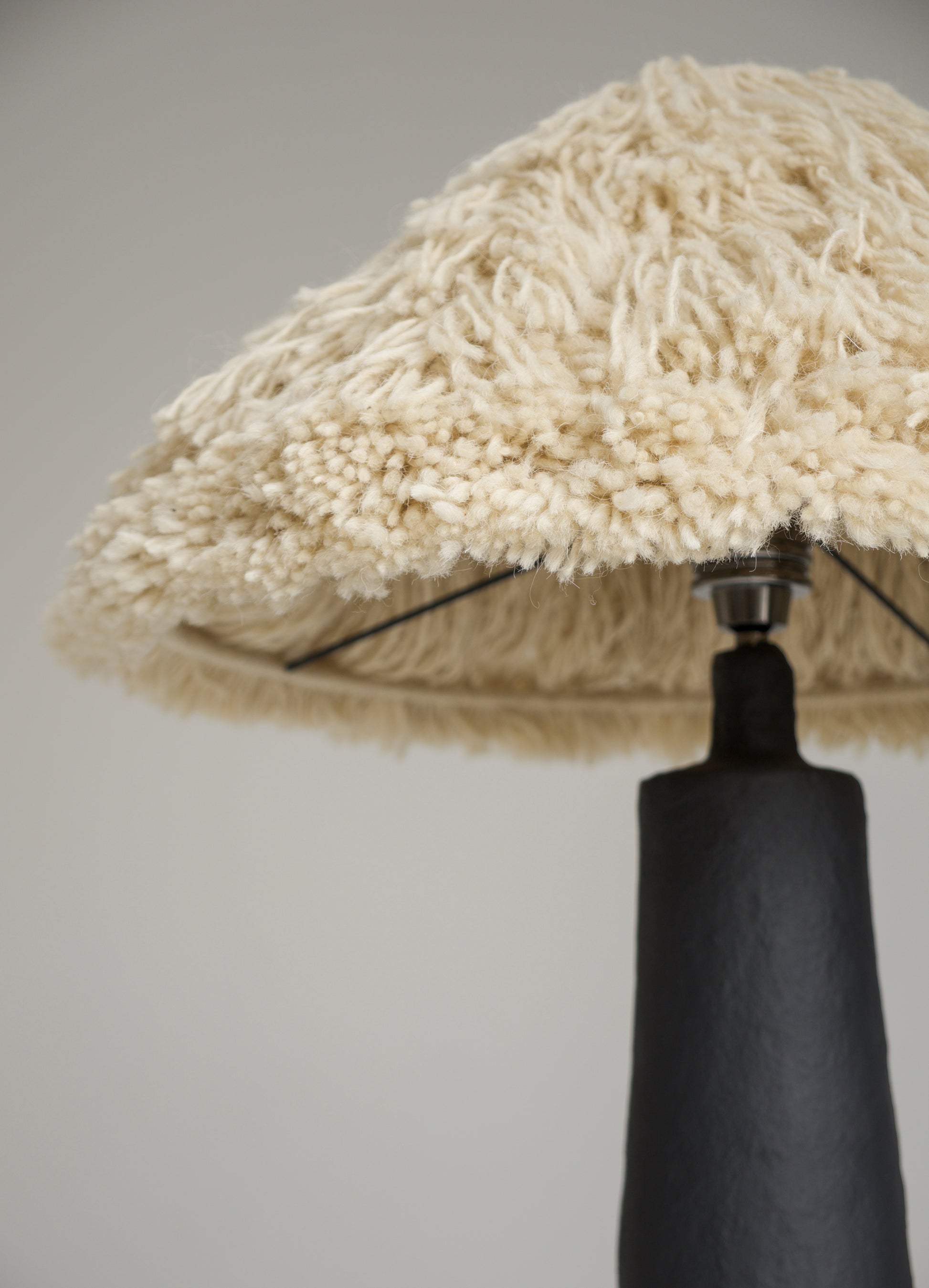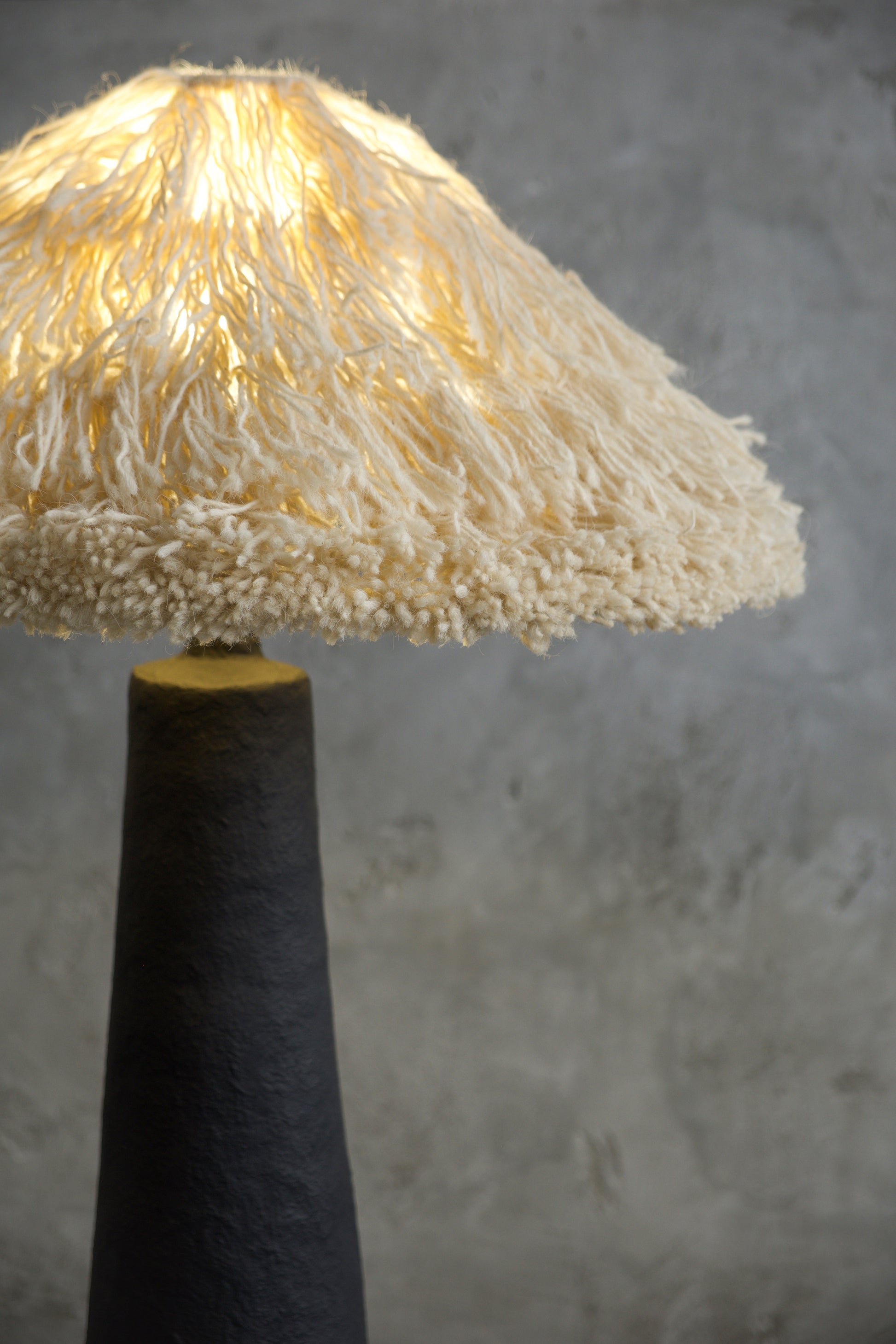 The lampshade is handcrafted from natural wool and available in ivory or graphite. Its soft, tactile texture gently diffuses light, creating a warm glow that contrasts with the restrained, mineral character of the base. Light appears to emerge from within the form rather than sit upon it — enhancing the lamp’s sculptural quality.