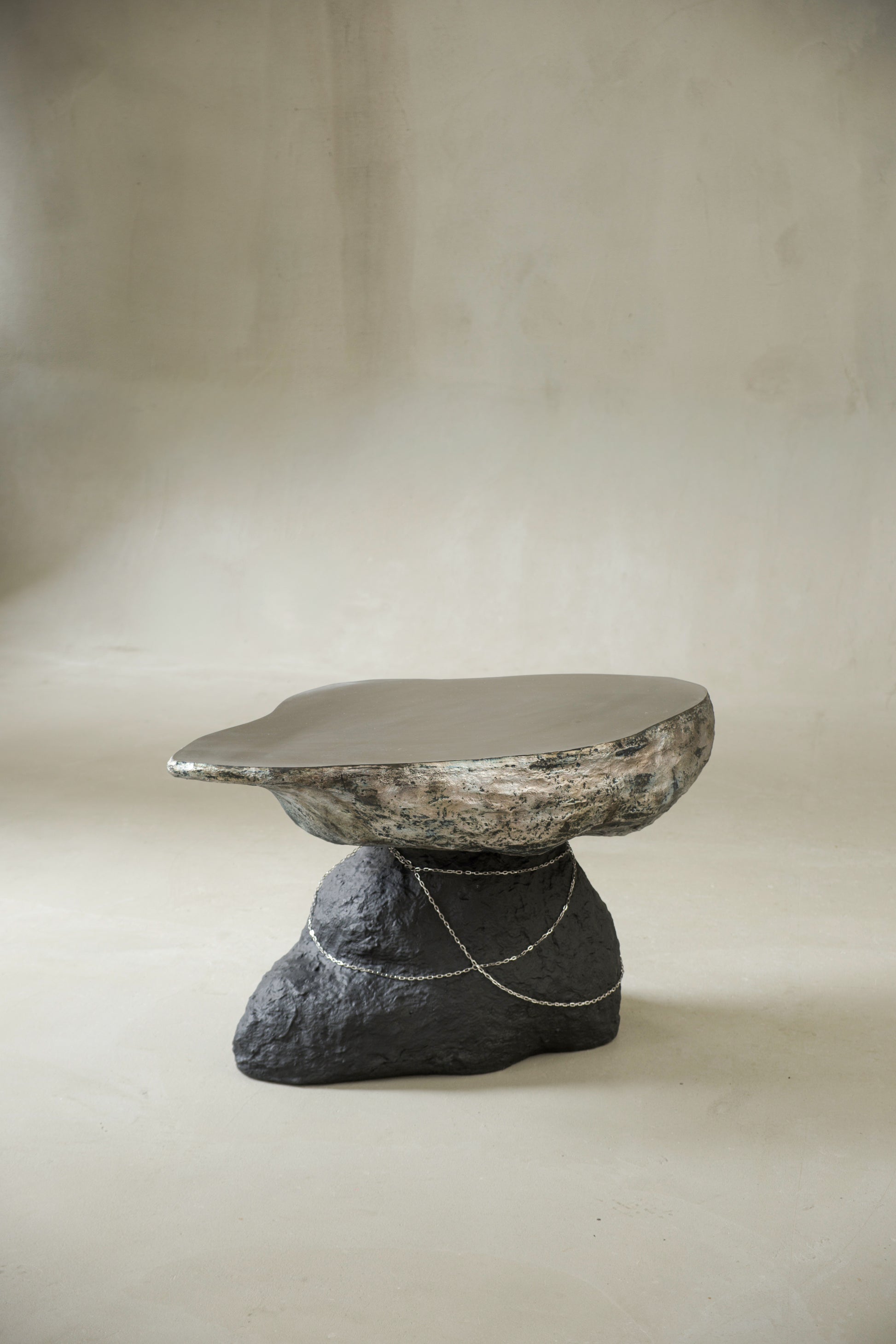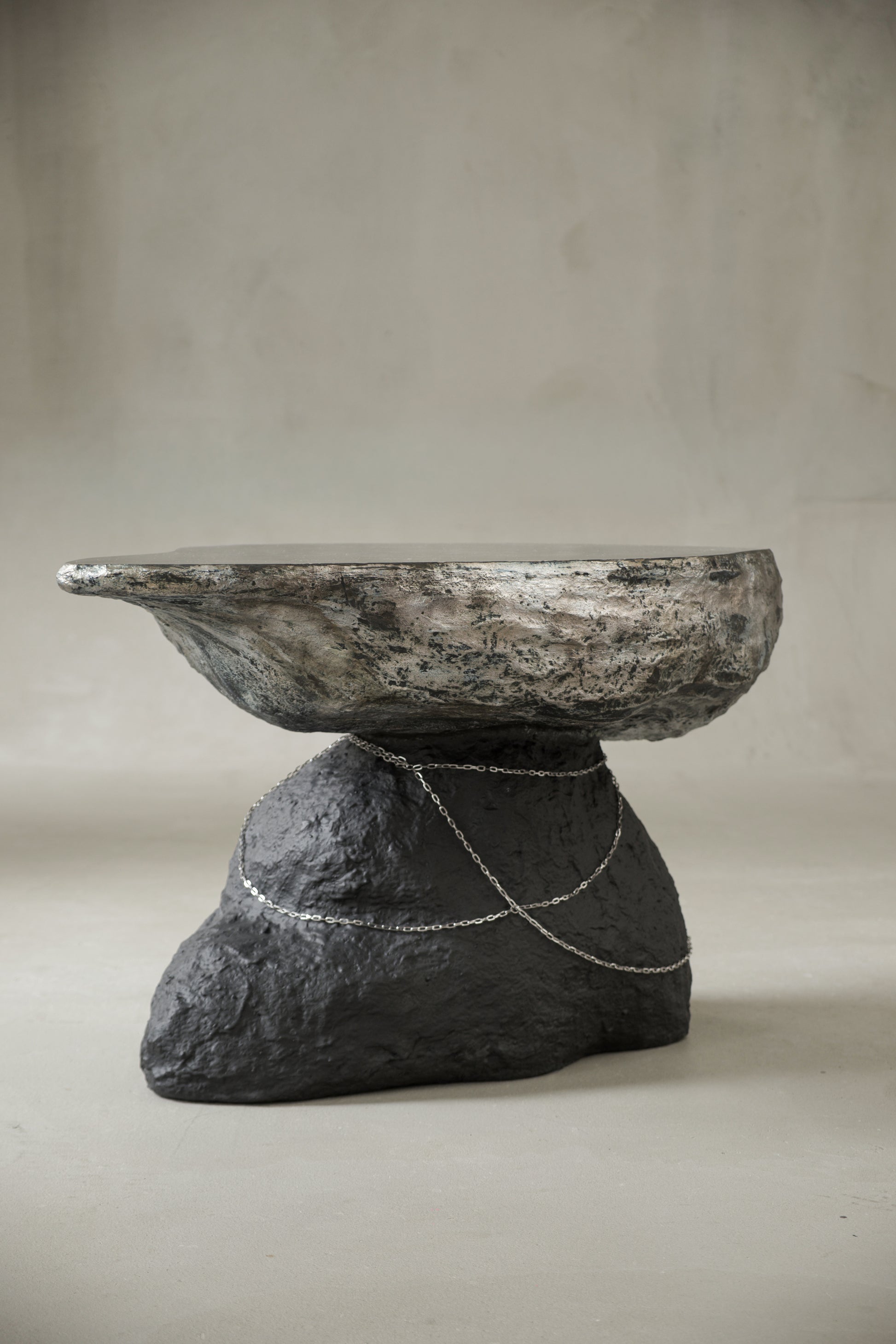 Its irregular, stone-like structure emphasizes material density and tactile depth.