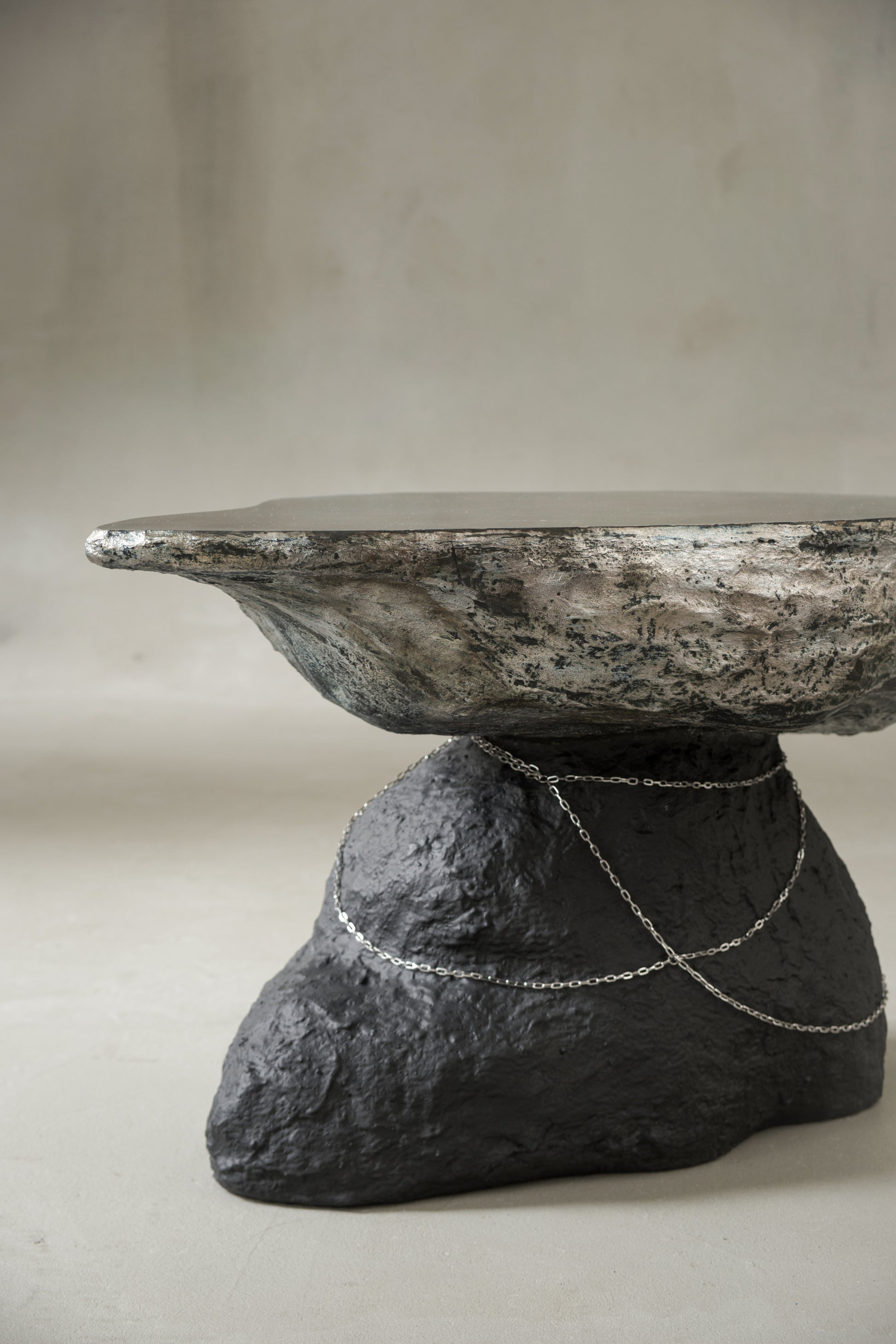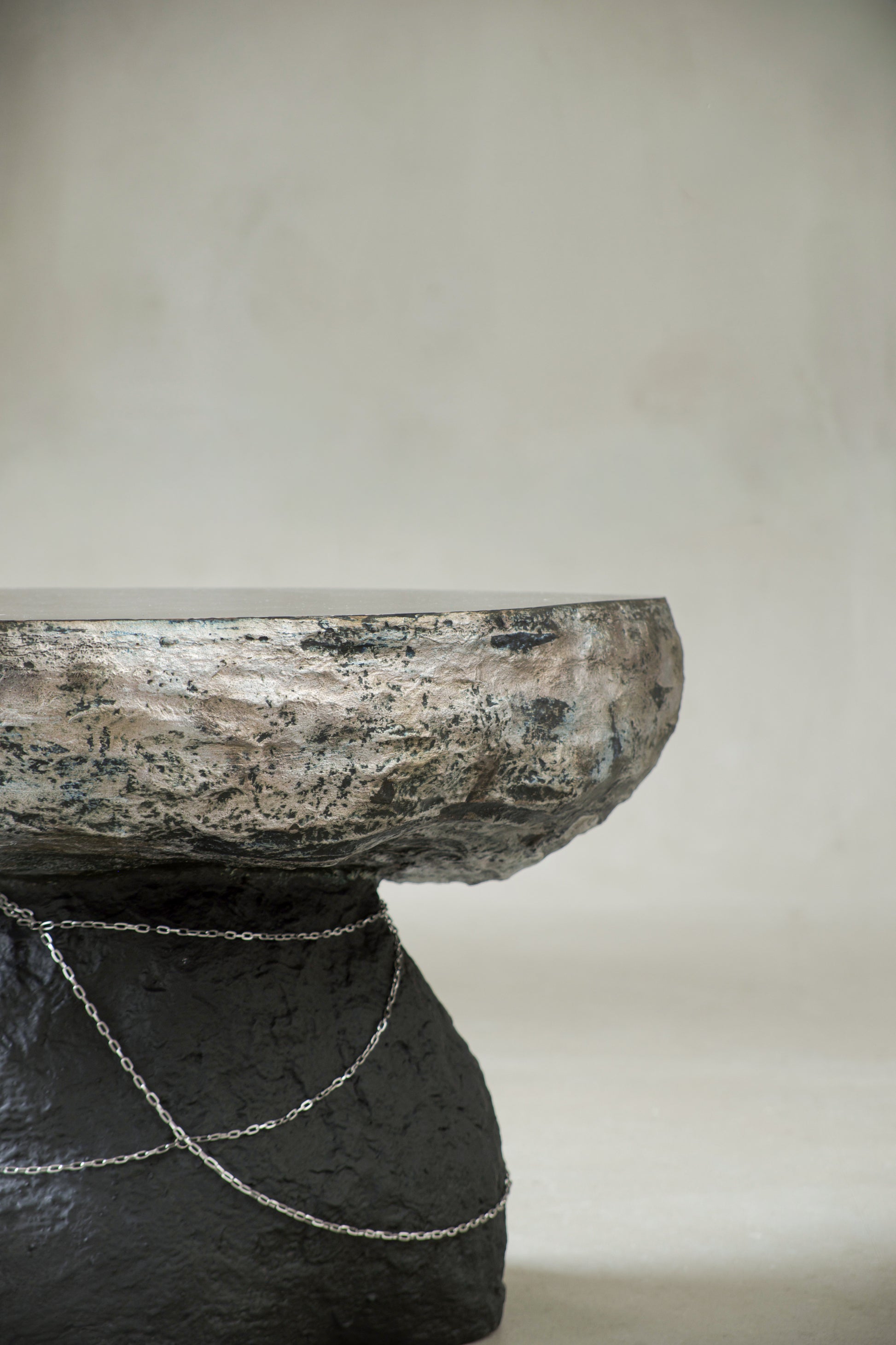 A stainless steel chain wraps around the base, introducing a subtle gesture of tension and connection.